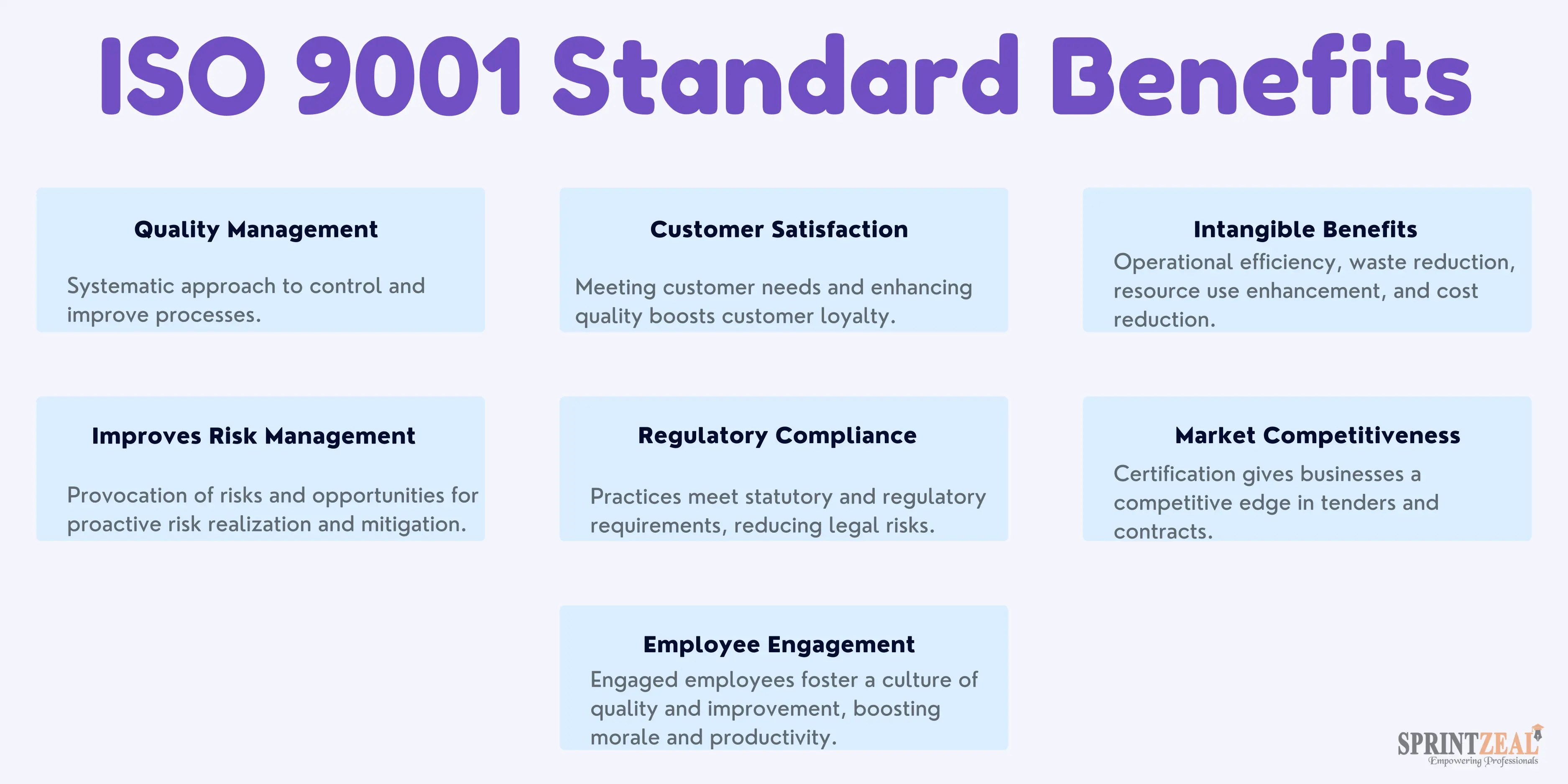 Training and awareness: The employees are trained about the ISO 9001 Standard and processes associated with the Quality Management System, using Sprintzeal's engaging learning management platform. This ensures all individuals value their roles and responsibilities, and empowers them to contribute to continuous improvement.