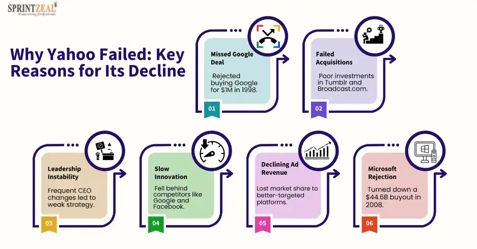 The series of events including missed opportunities to acquire Facebook and Google, wrong decision taken by the management, and too dependent on display ads, led to its downfall. We all know that ads were the only annoying part of Yahoo! Google overshadowed Yahoo with innovation and superior search technology!