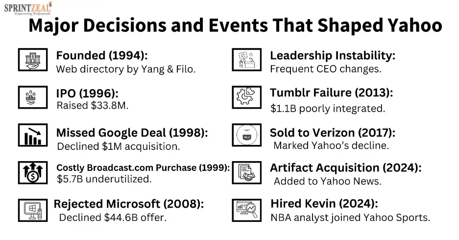 Yahoo’s history is a blend of innovation and missed opportunities, and its strategic missteps led to a massive decline. The company’s story underscores the importance of capturing market opportunities and maintaining strong, visionary leadership to navigate challenges and ensure long-term success.